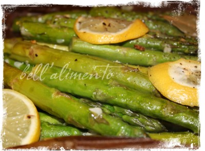 Preheat oven to 400. Take your asparagus and trim the ends (Tip: Hold one asparagus between your fingers and bend it, where it breaks naturally is where you trim it). Place the asparagus in a bowl add the minced garlic, season with salt & pepper (to your liking), drizzle a little olive oil over the asparagus. A couple of turns of the bowl should be plenty (just enough to coat), & toss. Place your seasoned asparagus at the bottom of the paper bag. Place lemon slices & bay leaves on top of asparagus. Fold the bag over & place onto a rimmed baking sheet, pour a little canola oil over the bag & rub in it completely (don't want it to catch on fire), make sure the bag is saturated. Bake for 30 minutes.
